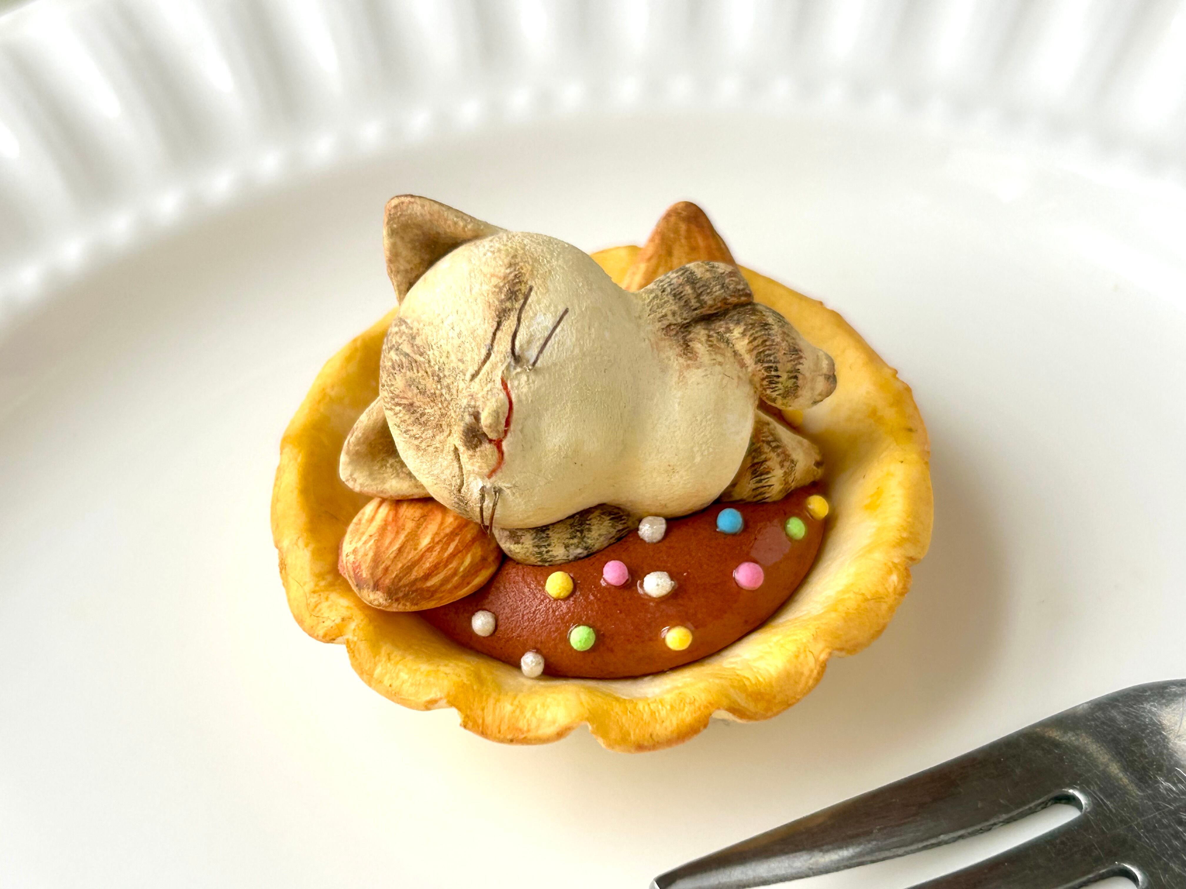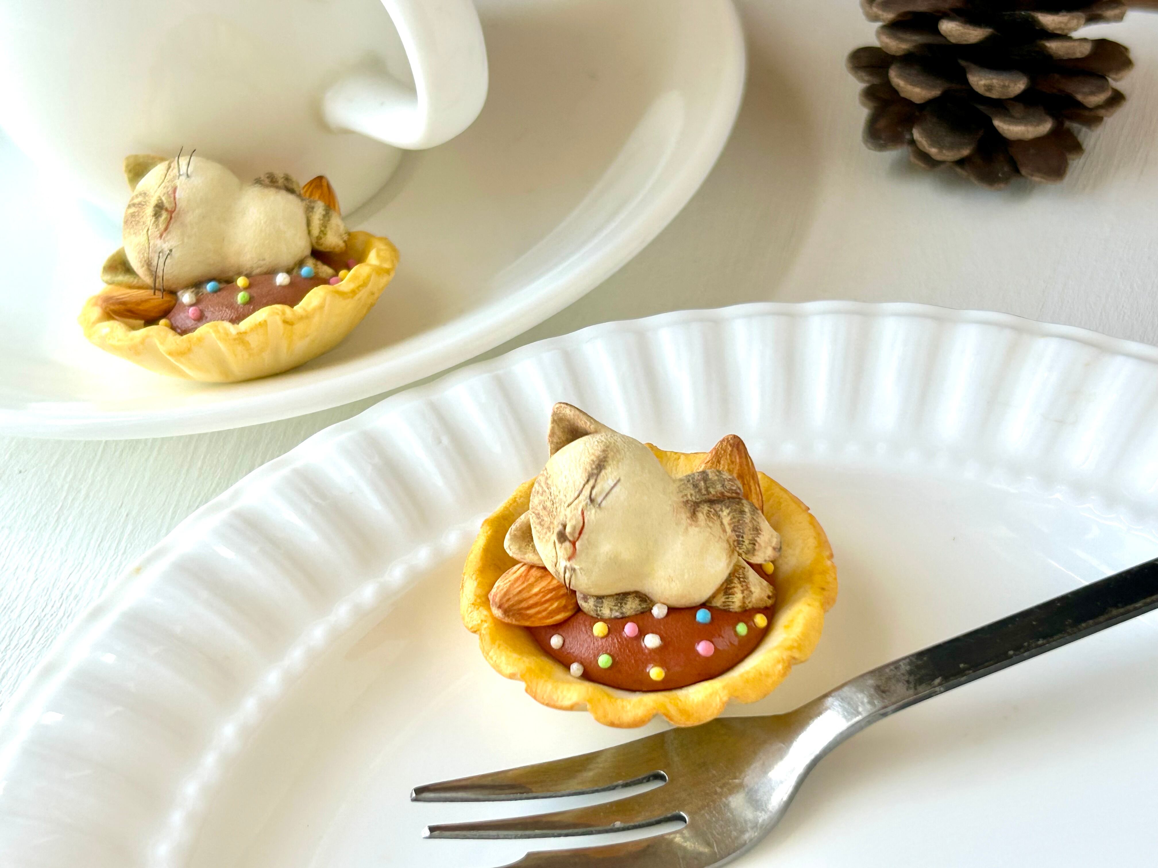 手のひらサイズのキジトラ猫さんがフェイクスイーツのタルトになりました。こんがりタルトとチョコクリームの上で、のんびりしています。アーモンドを枕にしてお昼寝です。