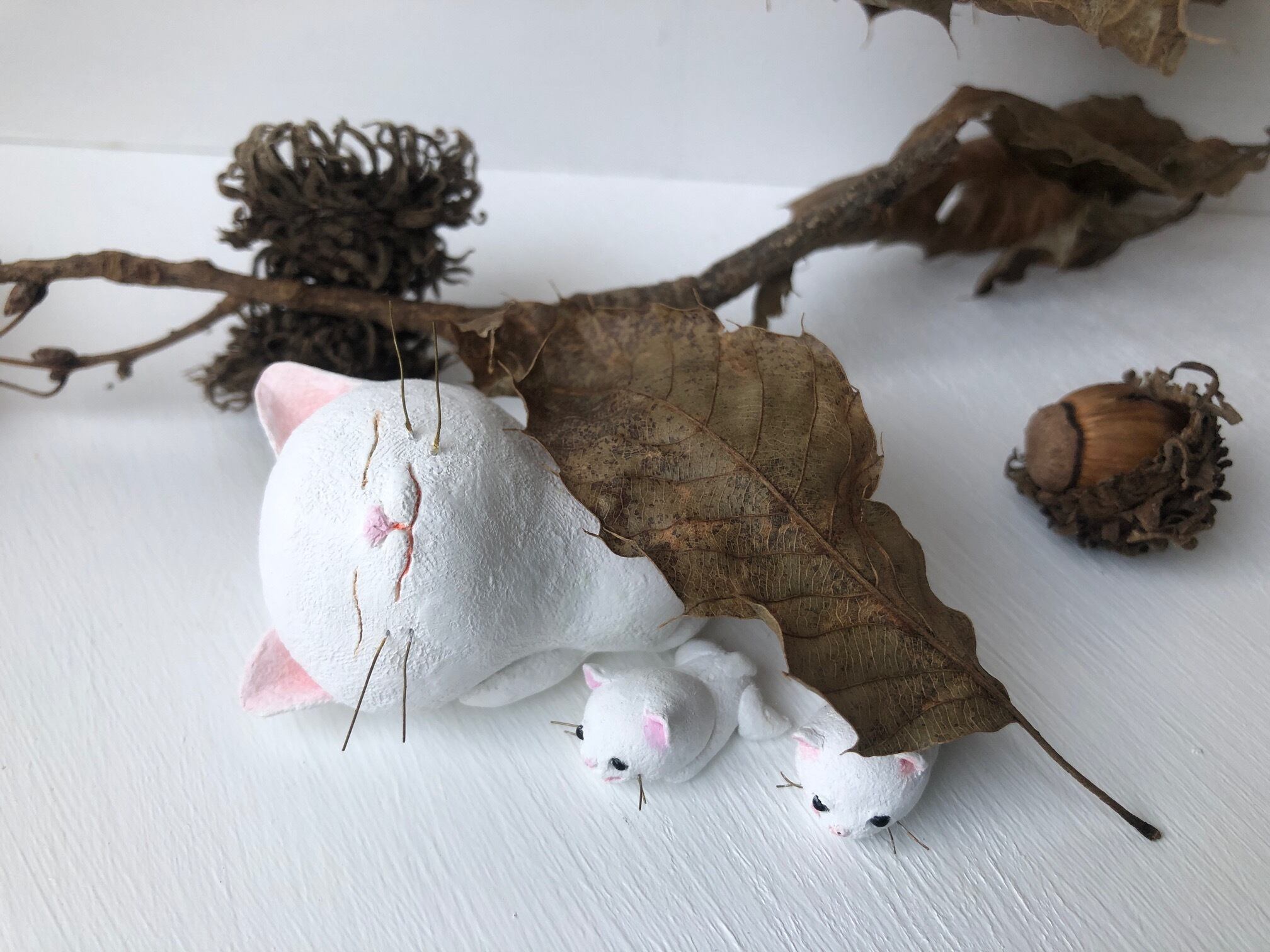 猫さん→紙粘土製、アクリル絵具で着色、二スで仕上げてあります。