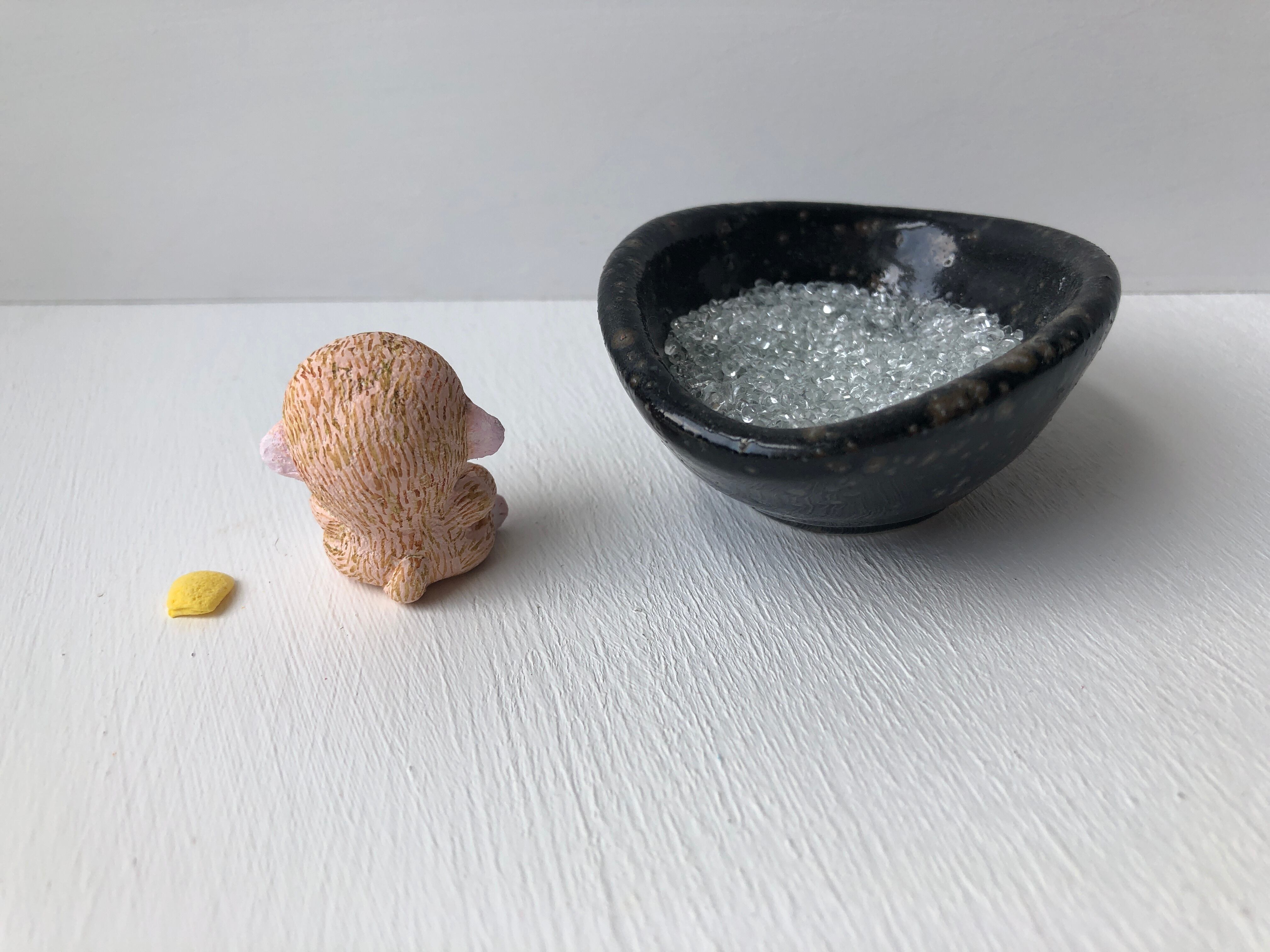 手のひらサイズのお猿さんが、のんびりお風呂に入っています。頭にタオルをのせて、ご機嫌です。お猿さん、タオル、小皿、ガラスビーズの4点セットでお届けします。