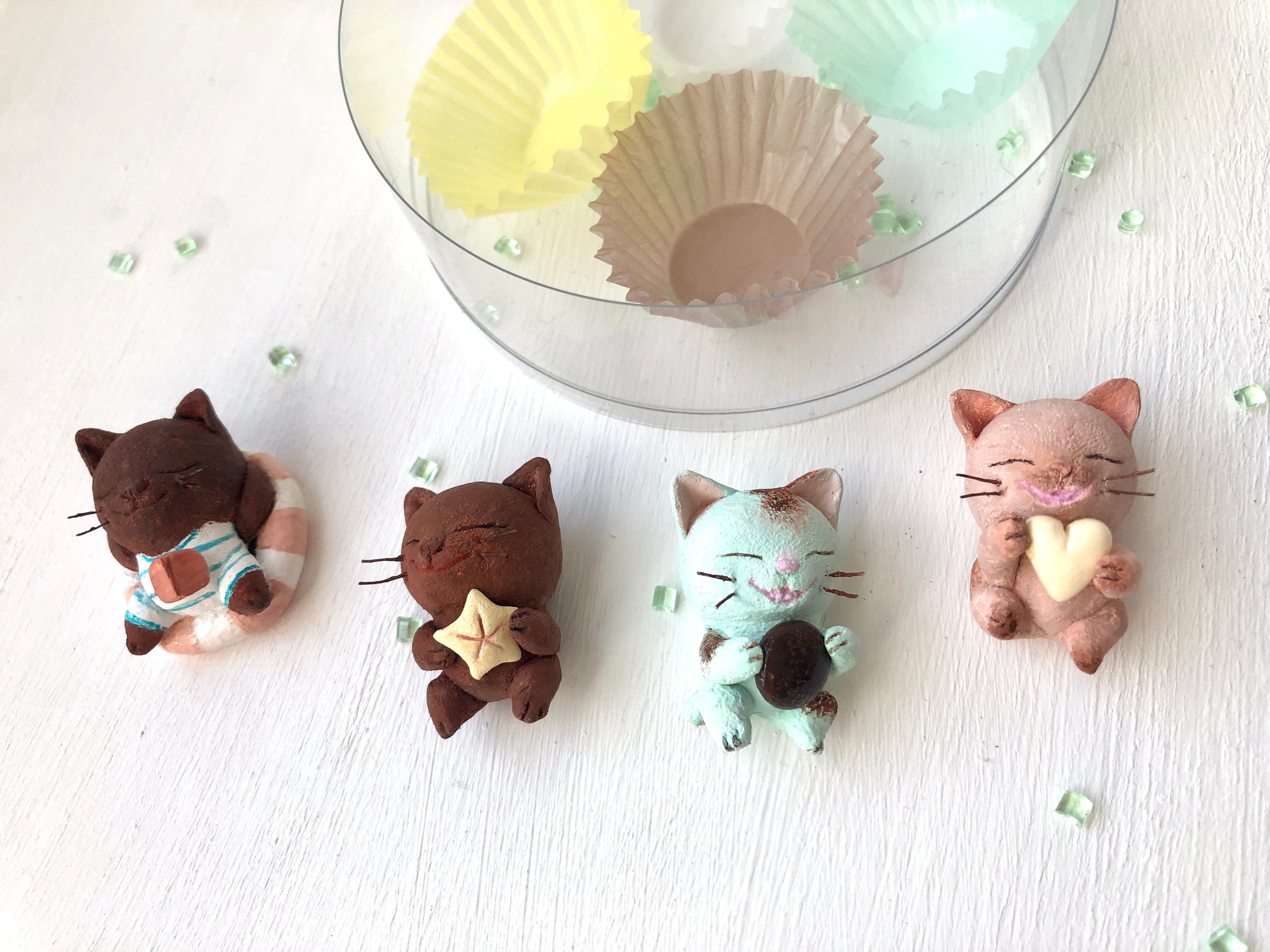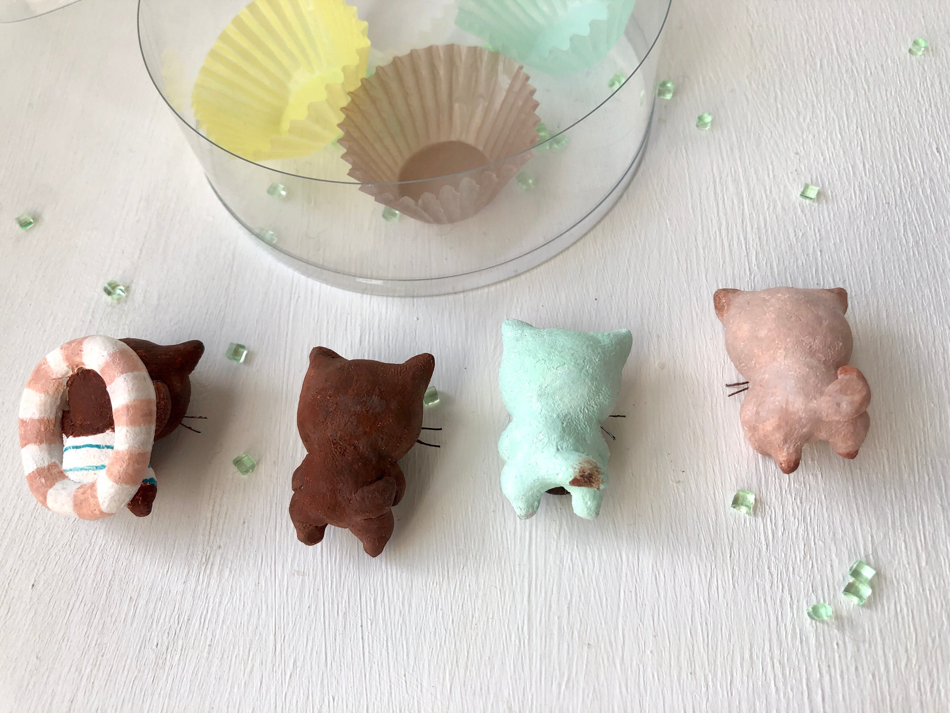 猫さん身長約3センチ。紙粘土、樹脂粘土製。アクリル絵具で着色、ニスで仕上げてあります。