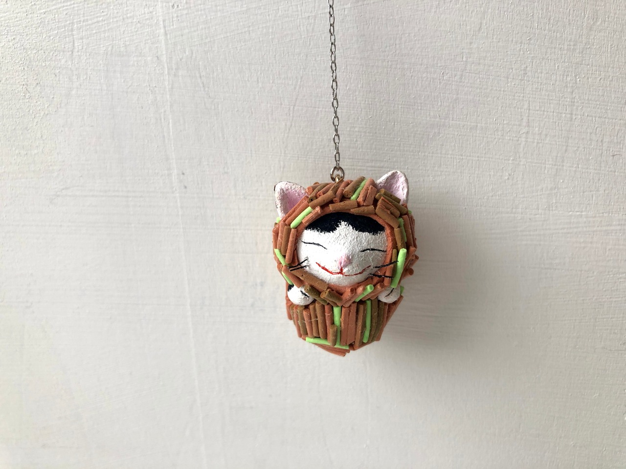 紙粘土、樹脂粘土製、アクリル絵の具で着色、ニスで仕上げてあります。頭頂部から細いチェーンでフックがついています。ちょっとしたところにぶら下げますと、ミノ虫感を楽しんで頂けます。