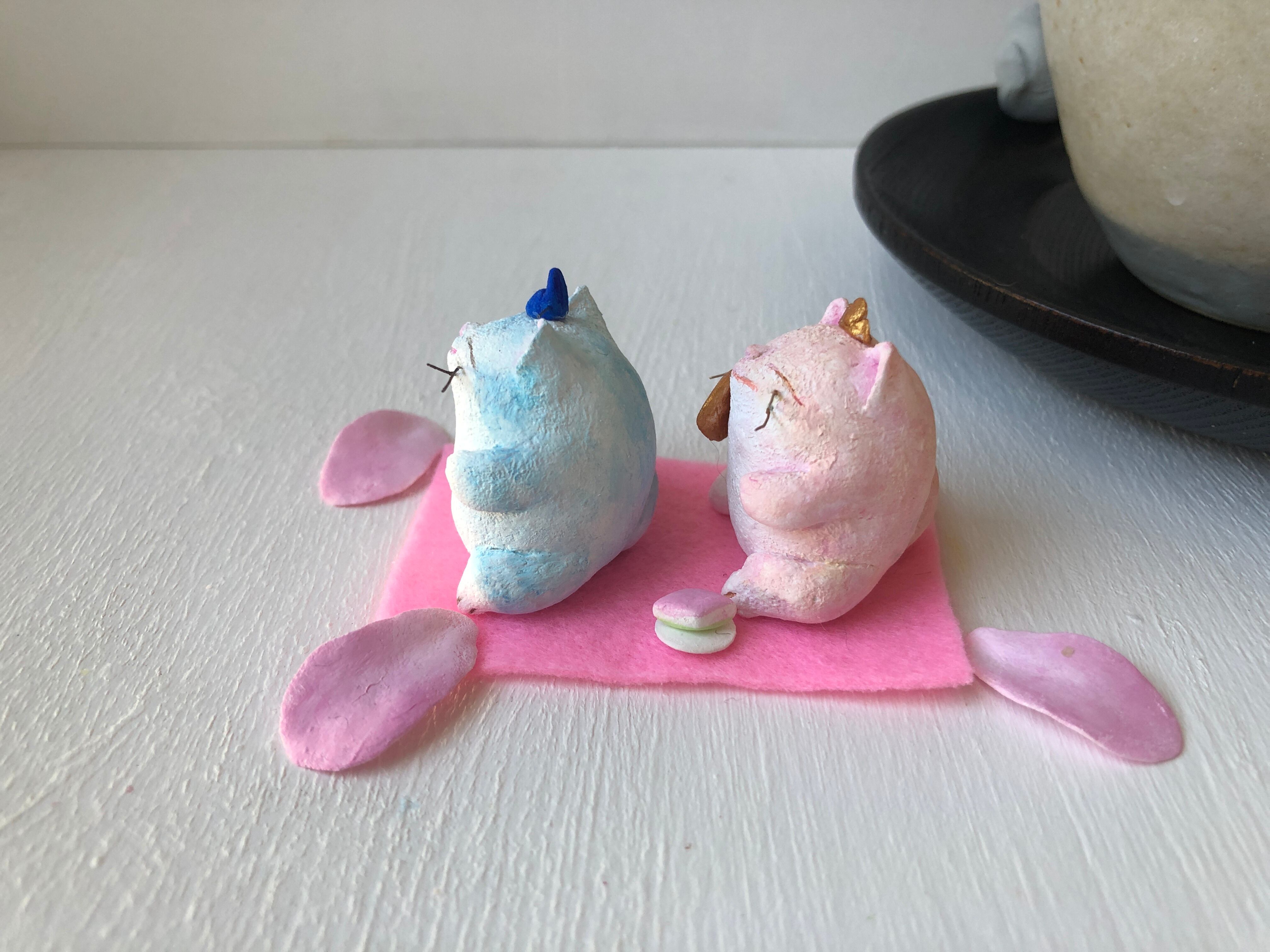 ふんわりパステルカラーのふくよかな猫さんのおひなさま。
