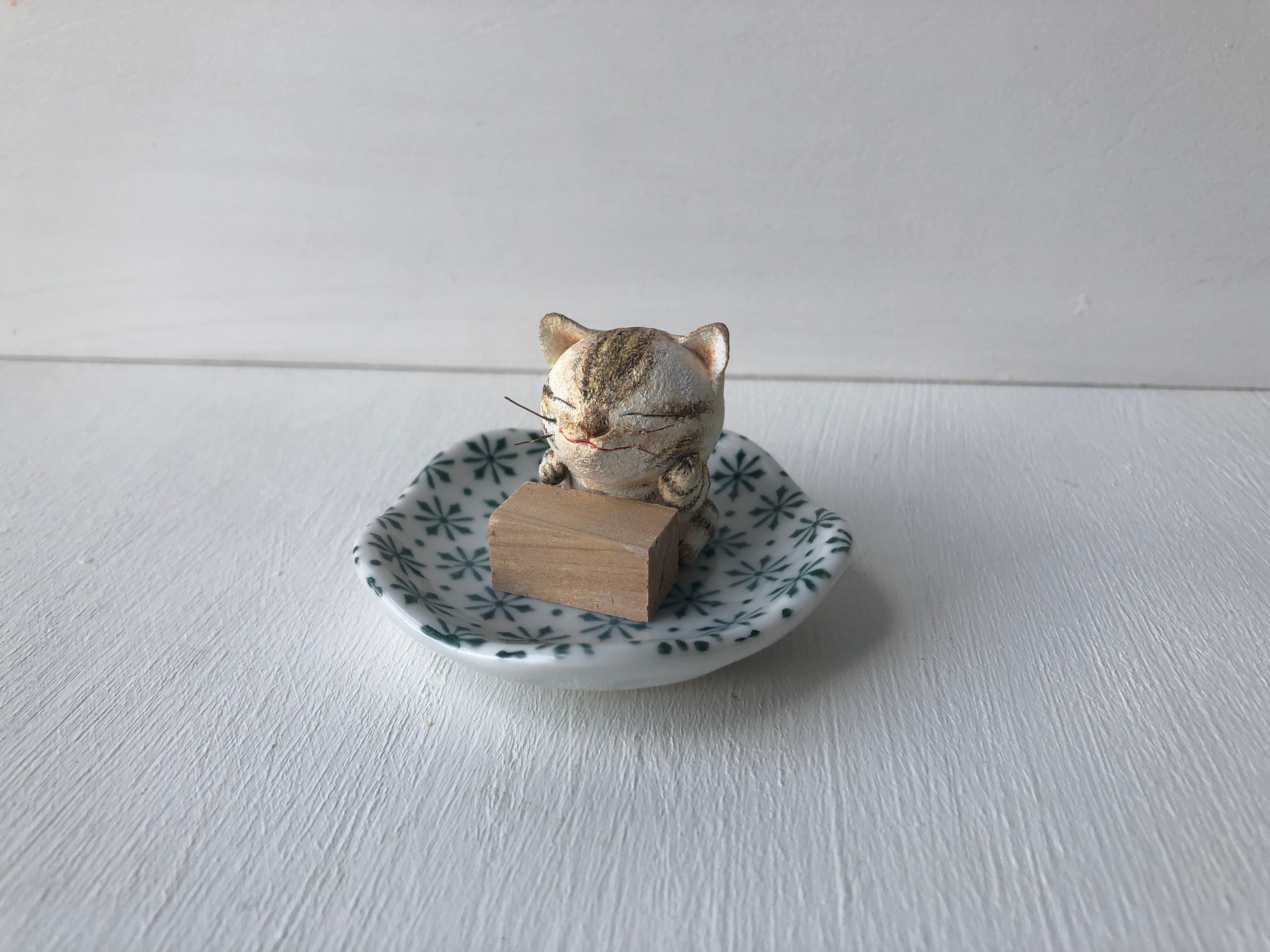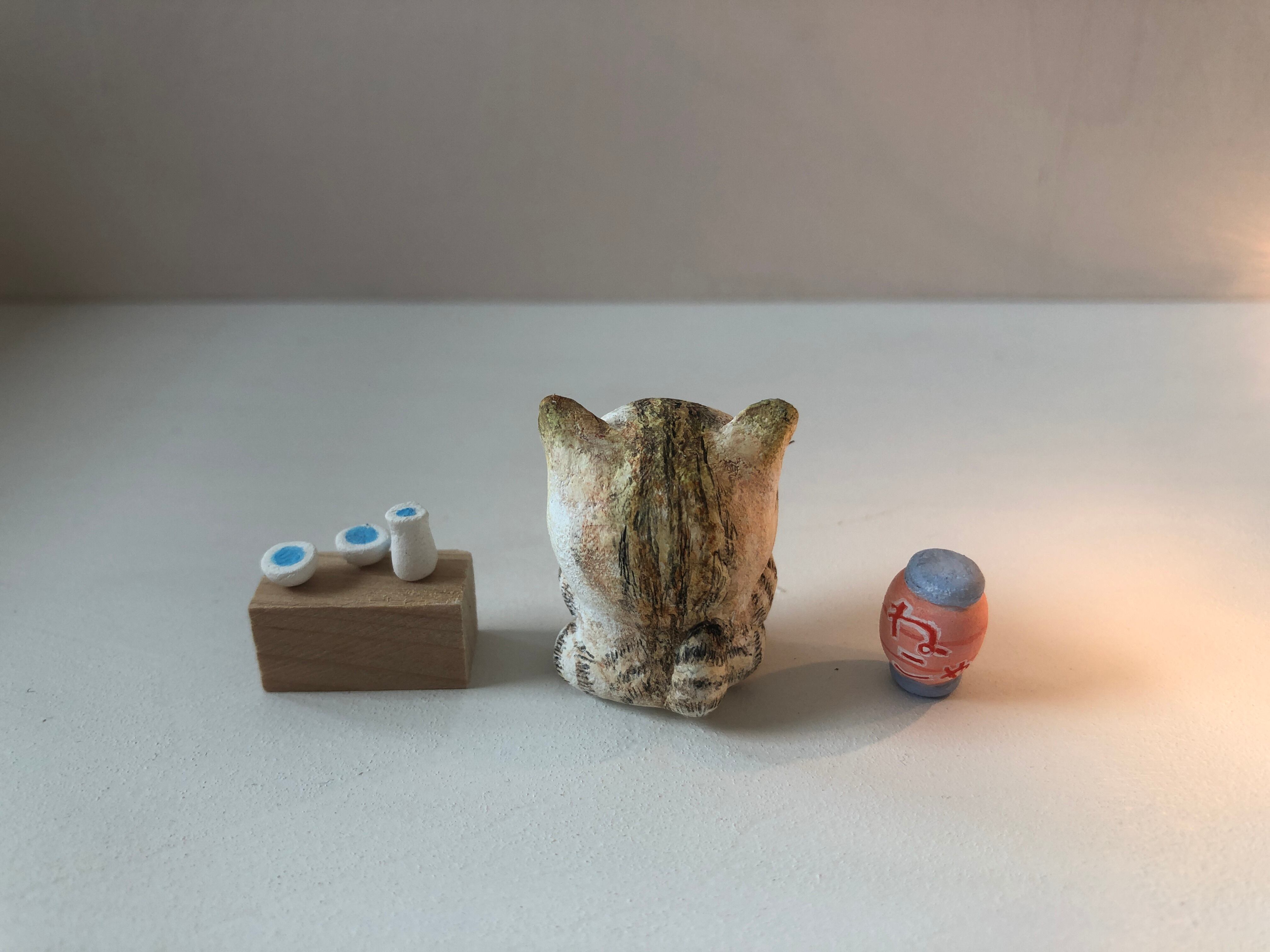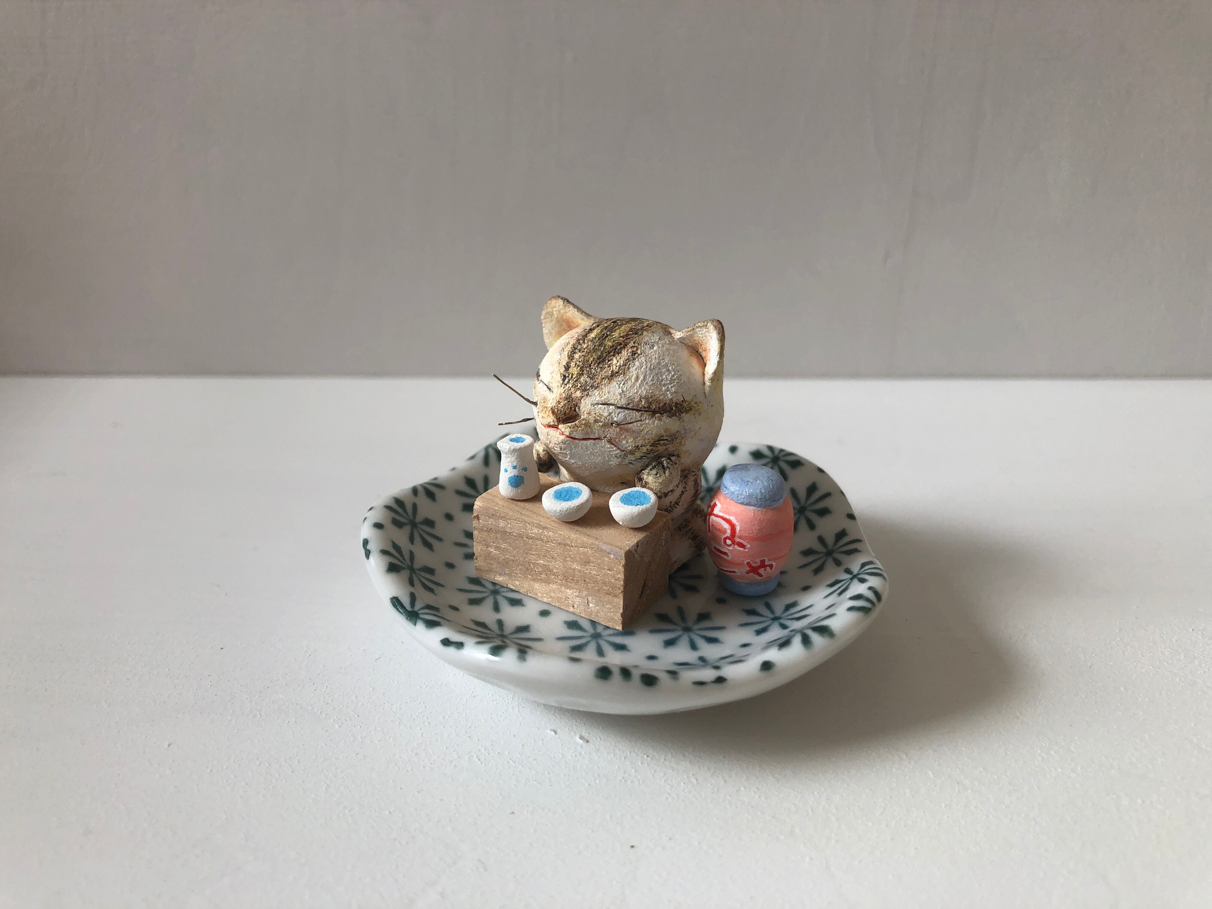 猫さん、とっくり、お猪口2個、テーブル、ちょうちん、本の5点セットでお届けします。(※小皿は付きません。)