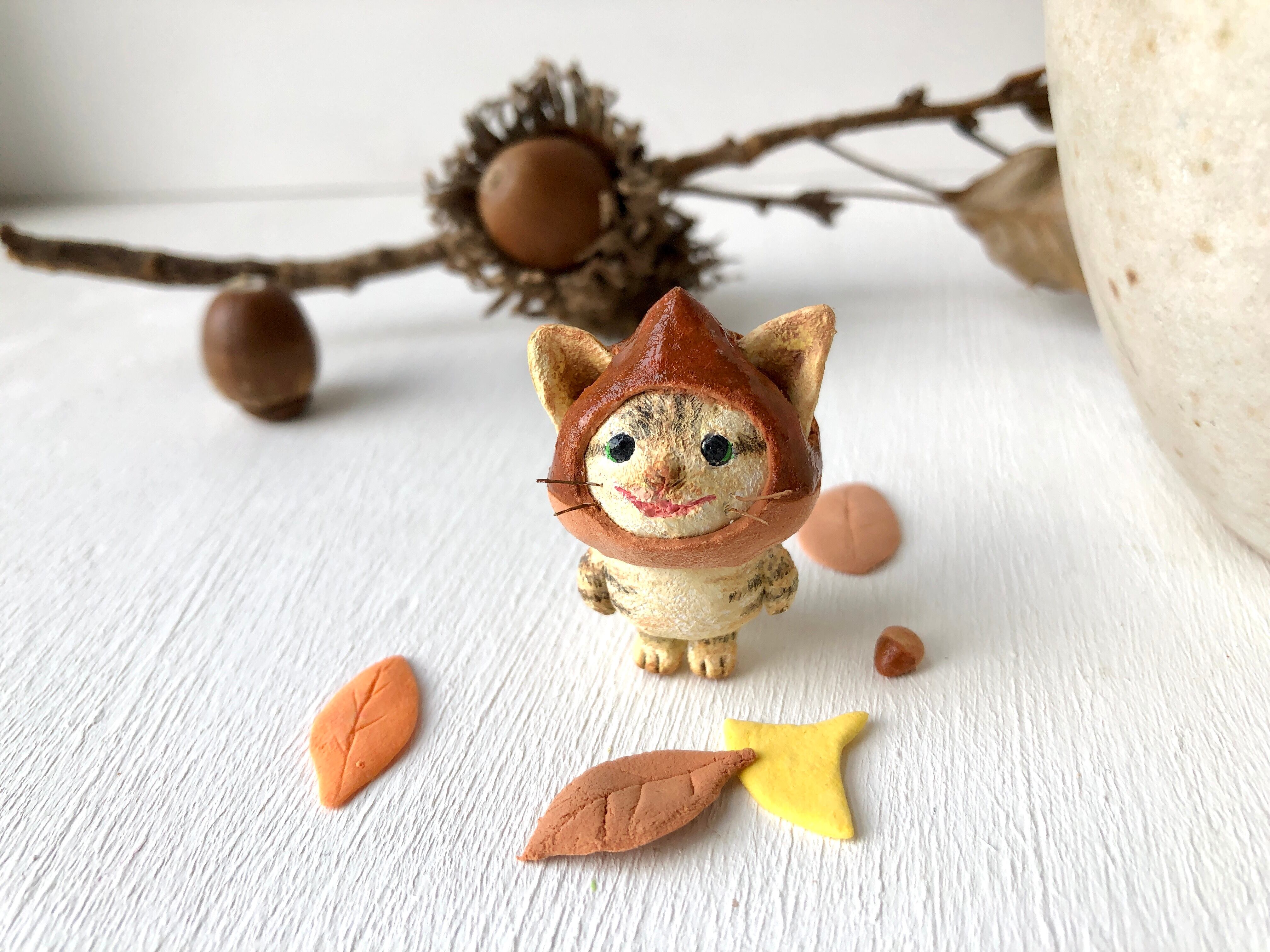 猫さん 紙粘土製、栗部分 樹脂粘土製。アクリル絵具で着色してあります。