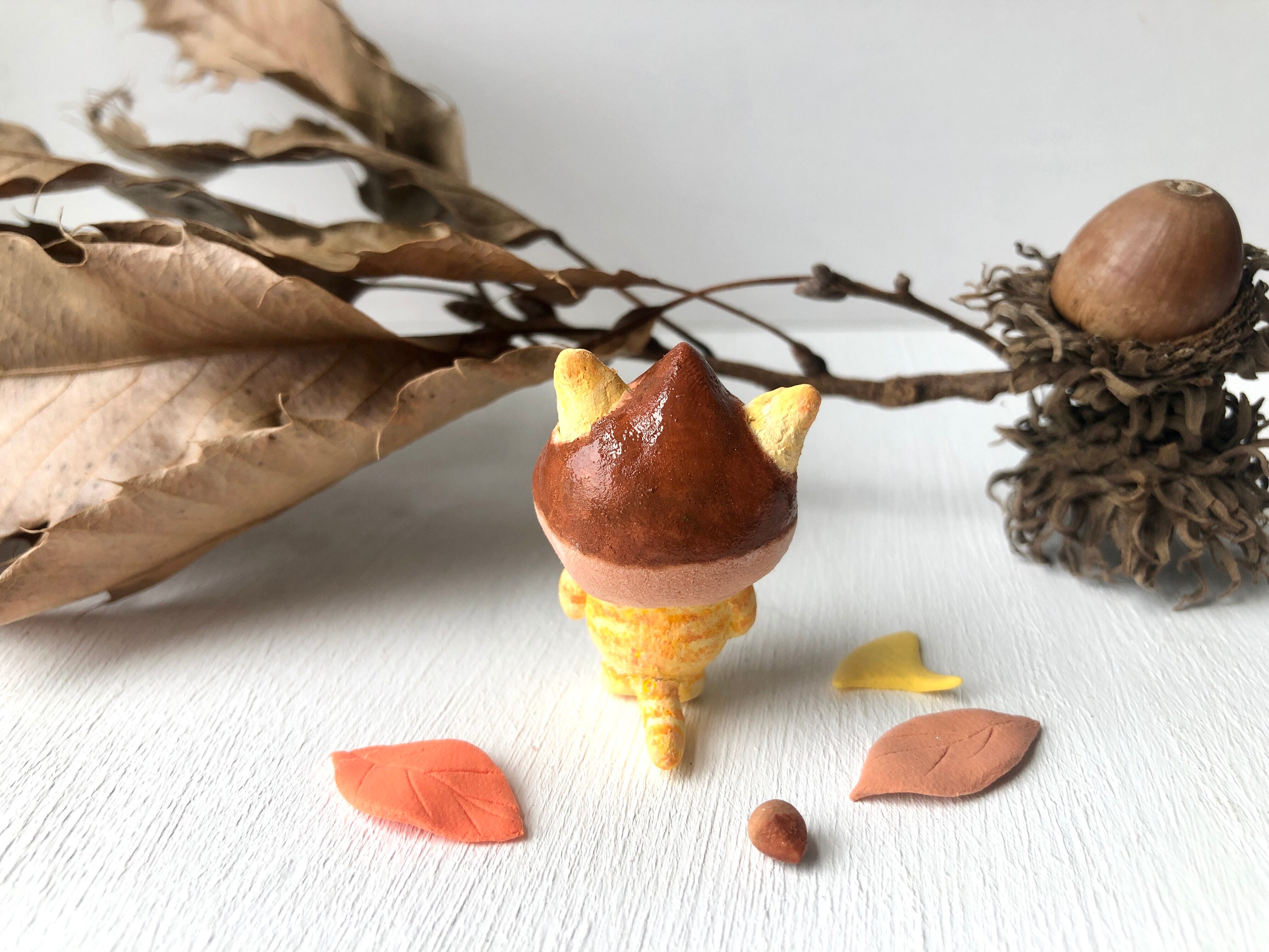 猫さん 紙粘土製、栗部分 樹脂粘土製。アクリル絵具で着色してあります。