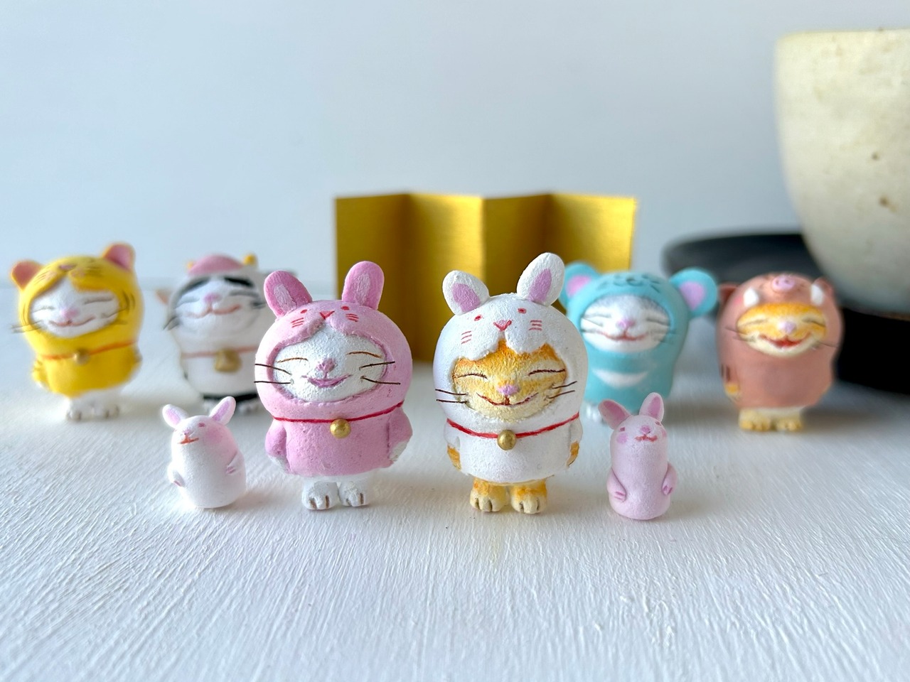 猫さん本体、紙粘土製。着ぐるみ部分とウサギさん、樹脂粘土製。