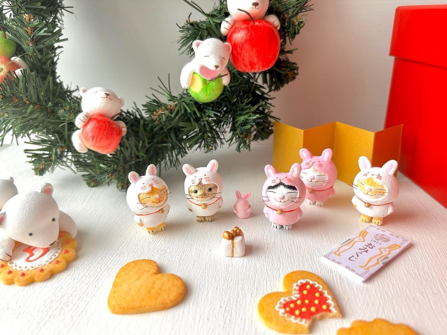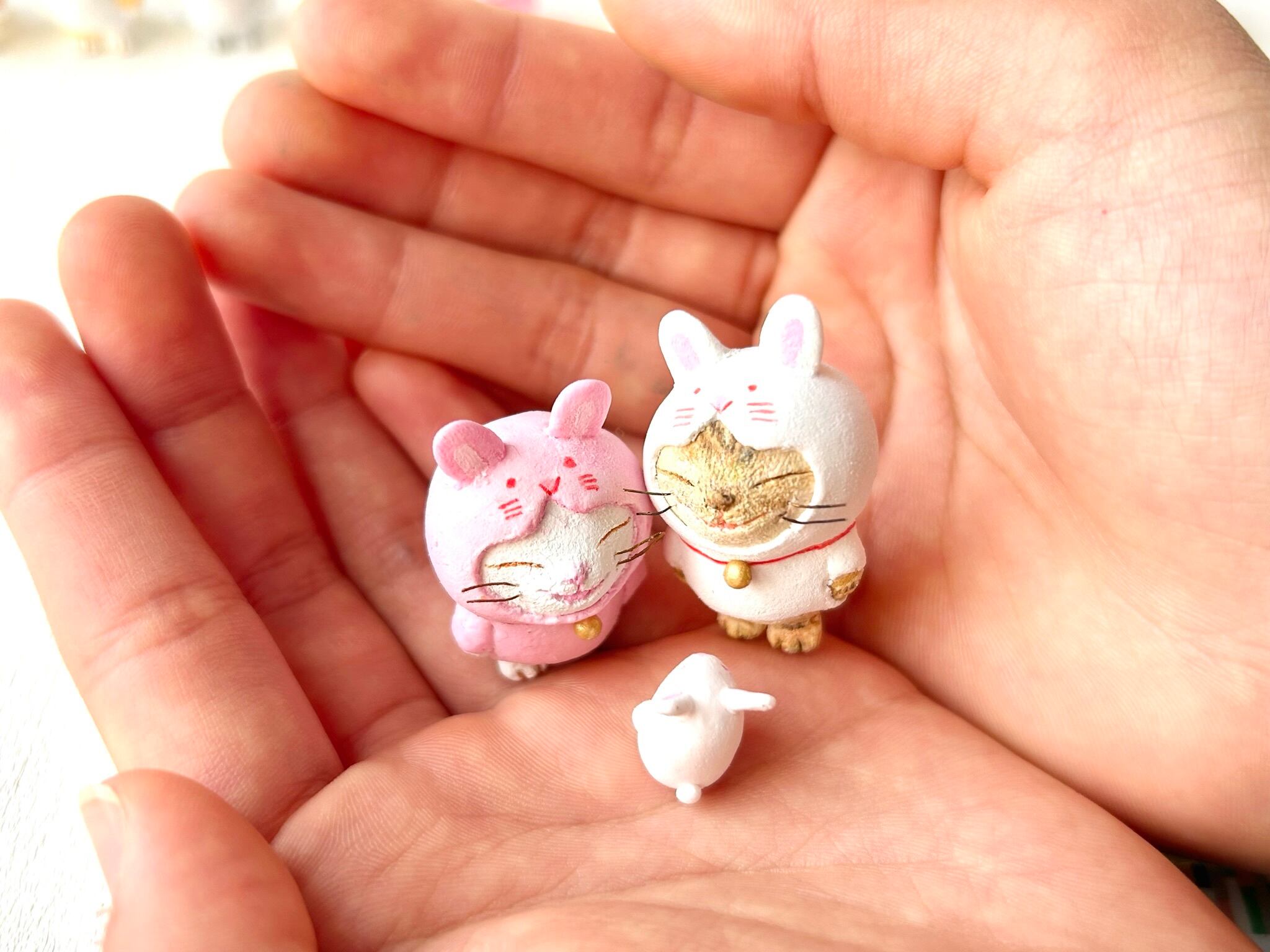 猫さん本体、紙粘土製。着ぐるみ部分とウサギさん、樹脂粘土製。