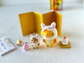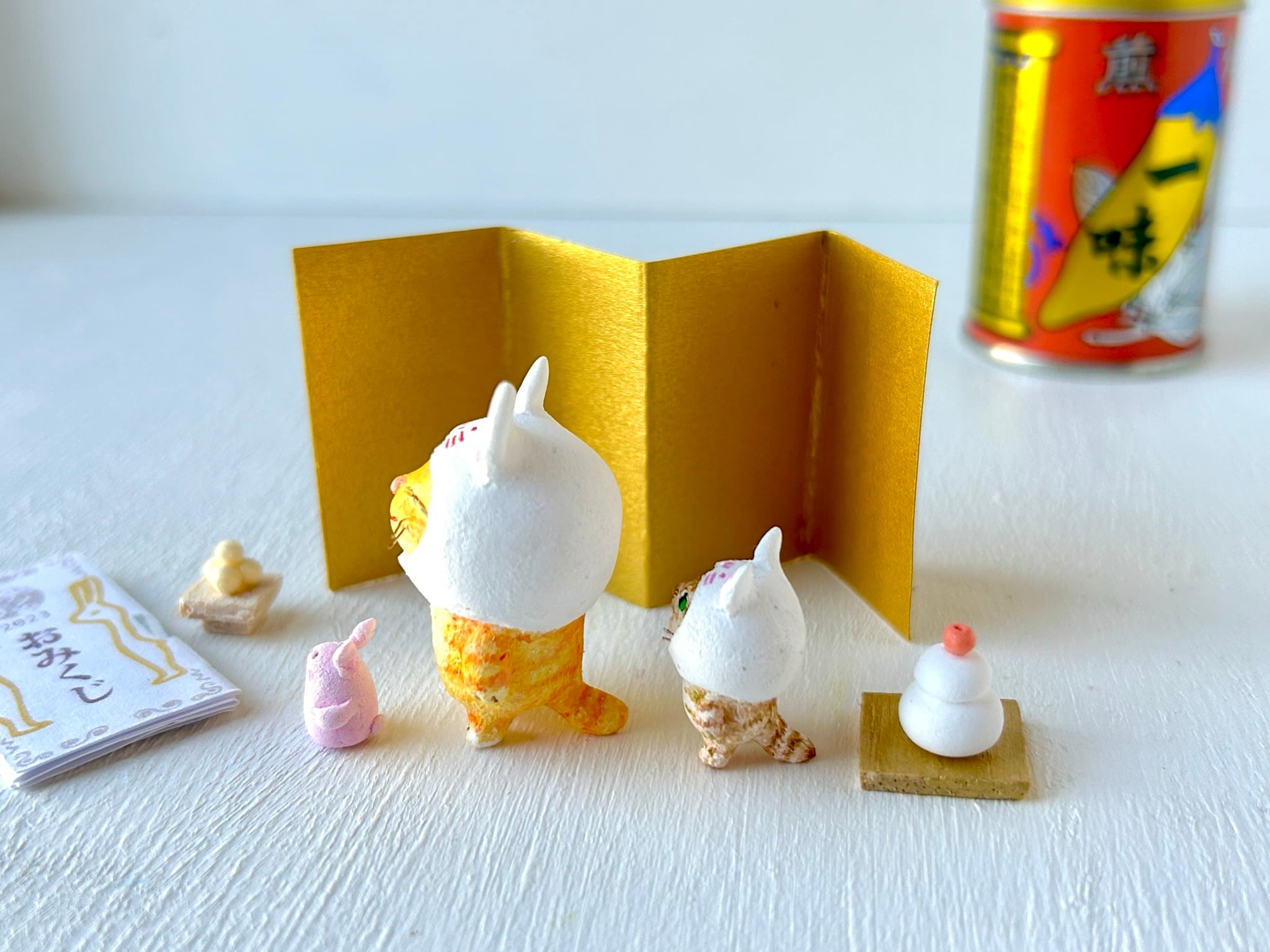 干支猫さん、子猫さん、ウサギさん、鏡餅、お月見だんご、屏風、おみくじの7点セットでお届けします。