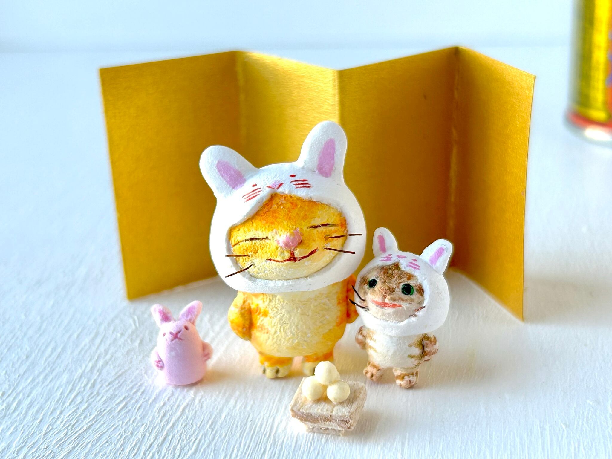 この猫さんコンビはお顔だけ「ウサ着」をかぶった春秋仕様の干支猫さんです。