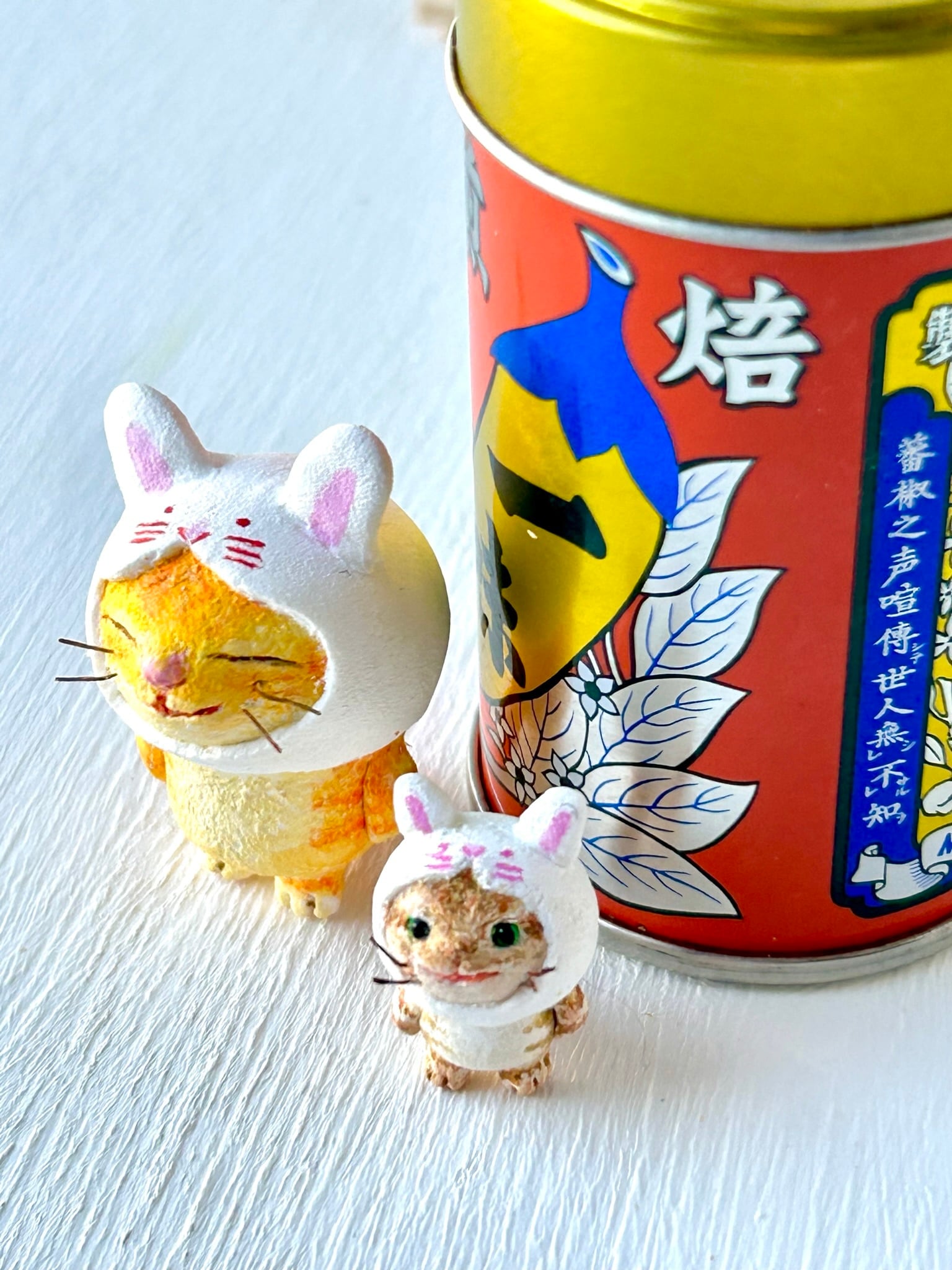 猫さん本体紙粘土製。ウサ着(うさぎウエア)部分、小物全般は樹脂粘土製です。