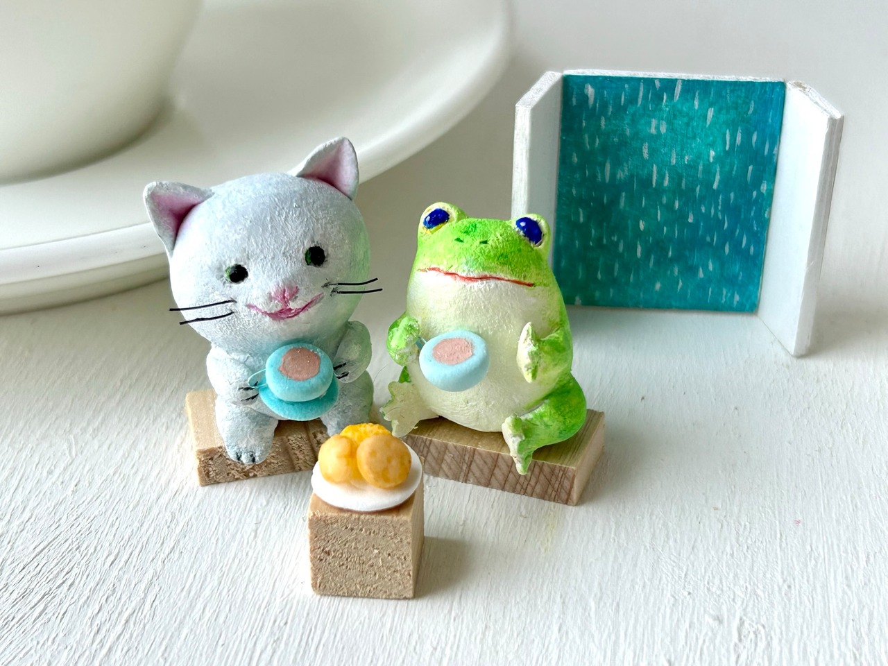 梅雨の季節になると、猫さんのおともだちのかえるさんが、遊びにきてくれます。