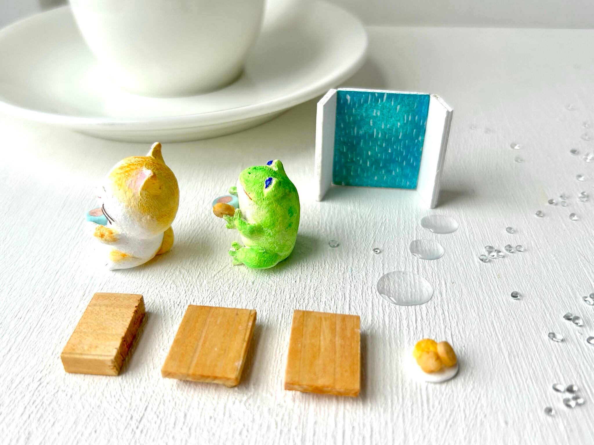 猫さん、かえるさん→紙粘土製、針金。