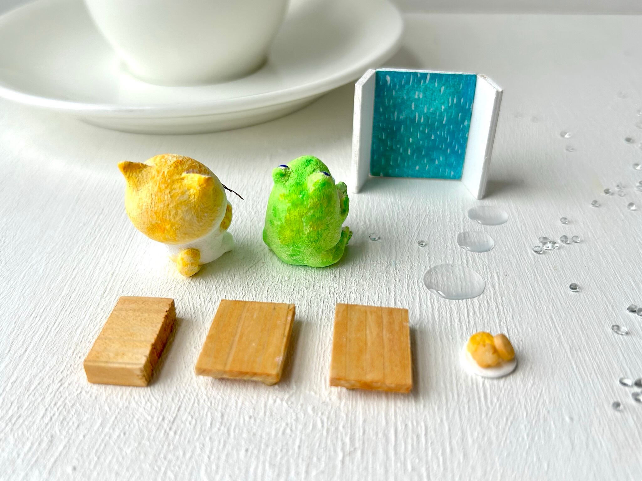 猫さん、かえるさん、窓、テーブル、椅子2つ、クッキー、レジンのしずく、ガラスビーズの9点セットでお届けします。