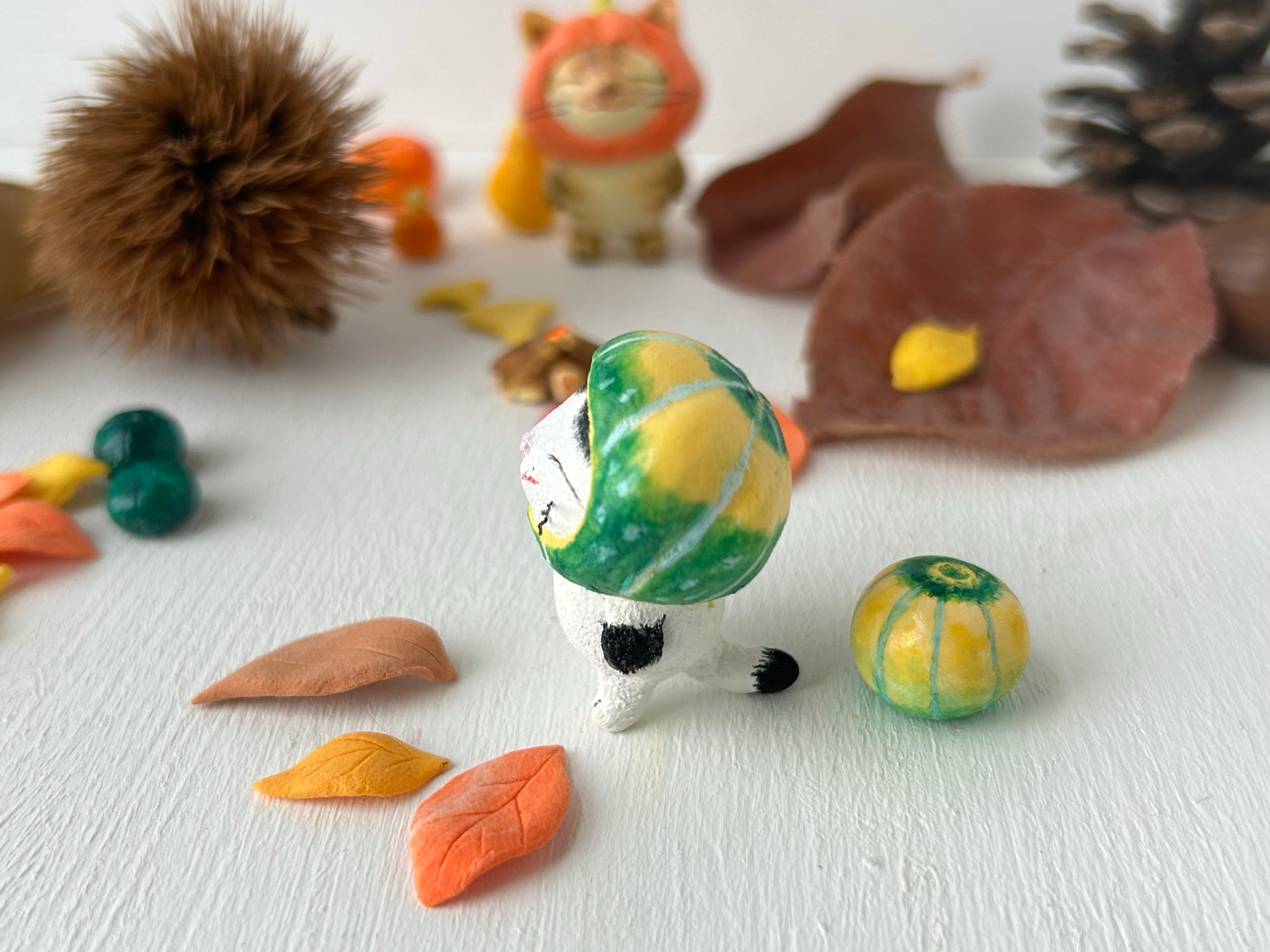 猫さん身長約3センチ。紙粘土、樹脂粘土製、アクリル絵具で着色してあります。
