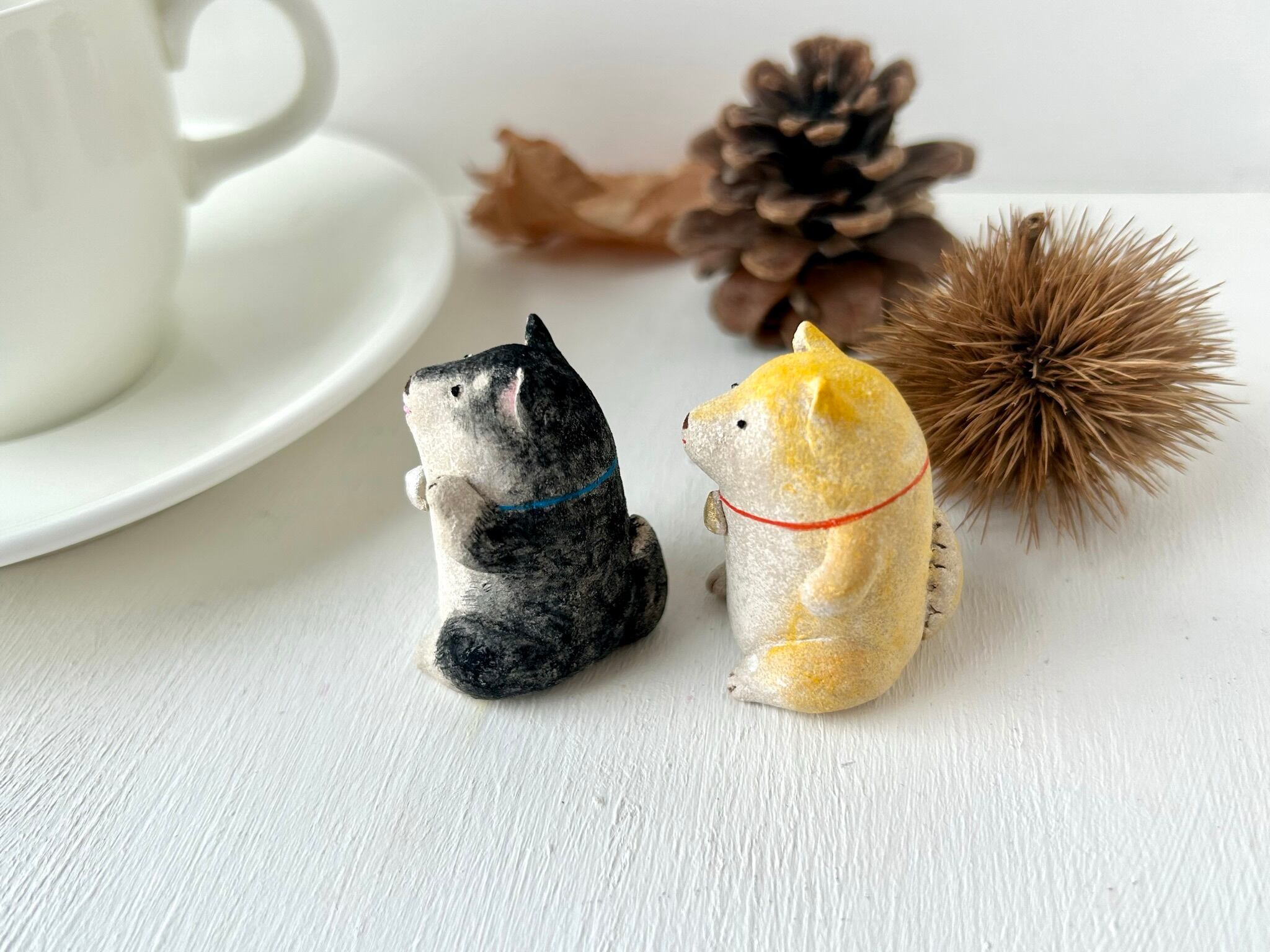 柴犬さん身長約4センチ、陶土粘土製。コンビでお届けします。