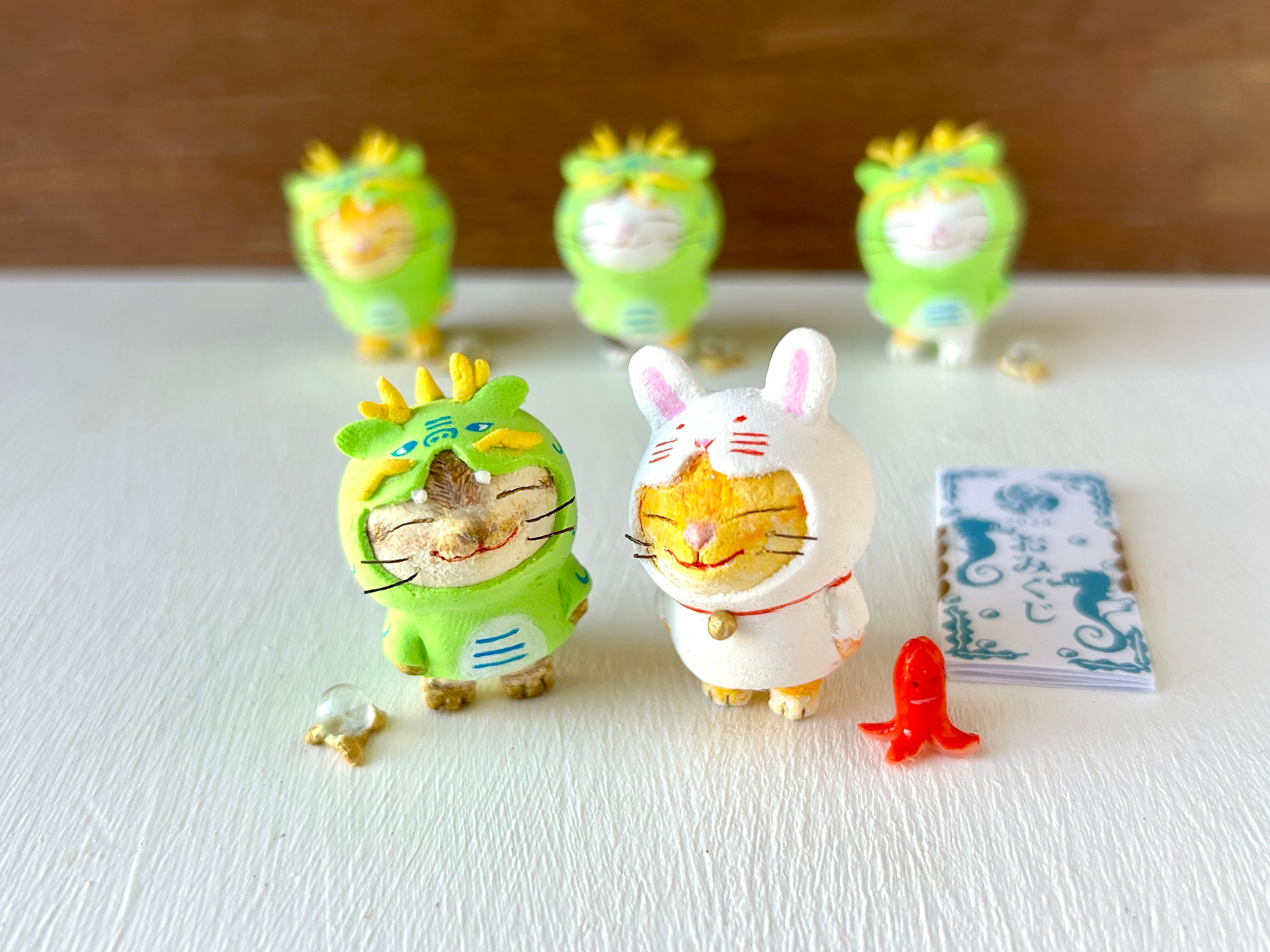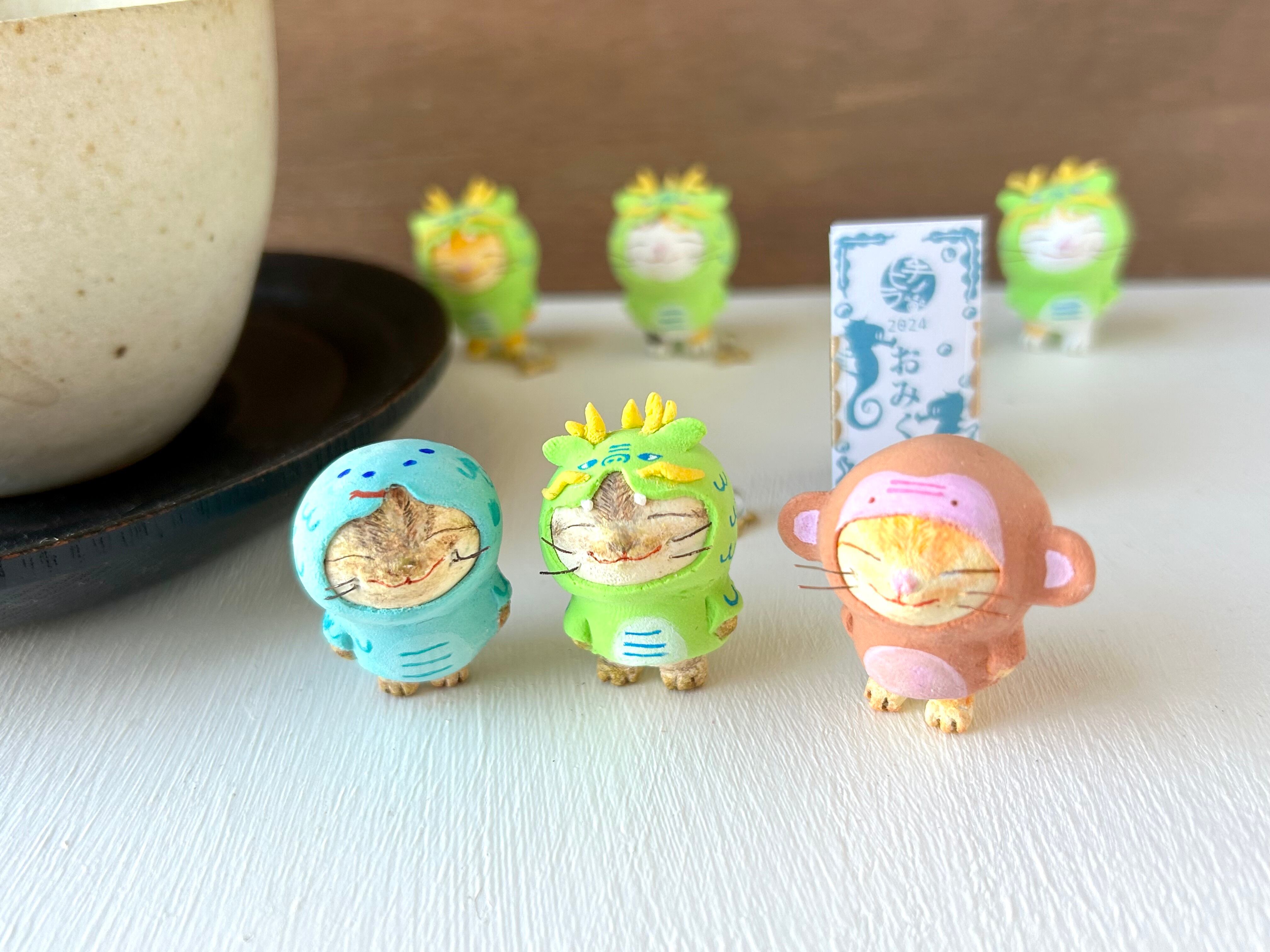 干支猫さんが今年もやってきました。龍のかぶりもので、キリッとキメたニャ! おめでたい龍の玉とおみくじもセットでお届けします。 猫さん身長約3センチ 猫さん 紙粘土、樹脂粘土 龍の玉 アクリル、樹脂粘土
